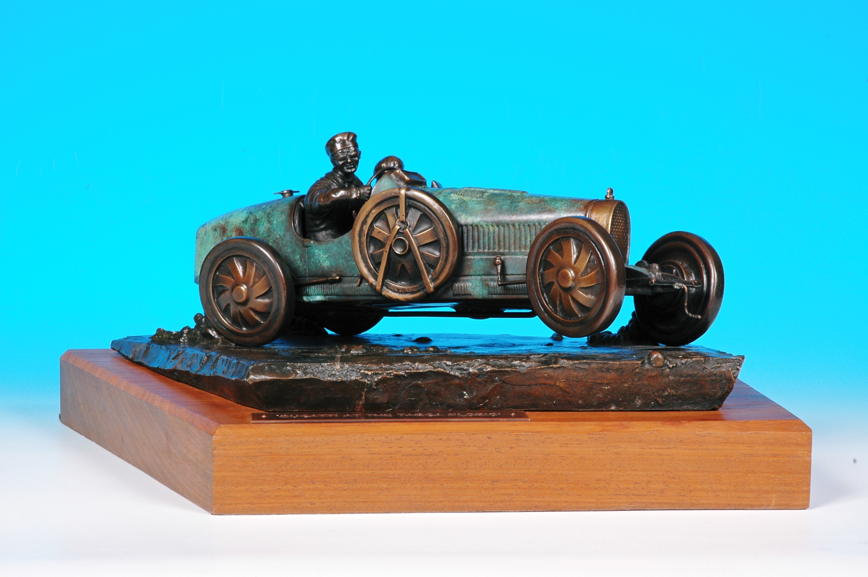The sculpture is available in a range of patinas and can be mounted on a hardwood or granite base (displayed here in blue and green on teak). Production is strictly limited to 9 sculptures; each signed and numbered, with a certificate of authenticity. The price of this limited edition is £3,000, plus carriage. To order your piece of Targa Florio/Bugatti history, a deposit of £800 secures your sculpture.