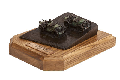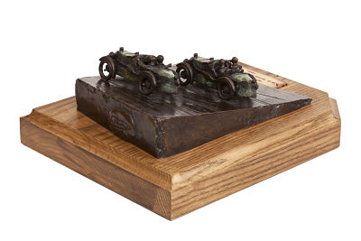 The Magic Midgets sculpture features two C-type Midgets from M.G.’s victorious works team, in the 1931 double-twelve race at Brooklands. The base has a brown patina, while the cars carry a green race-weathered appearance, after the gruelling 24 hours.